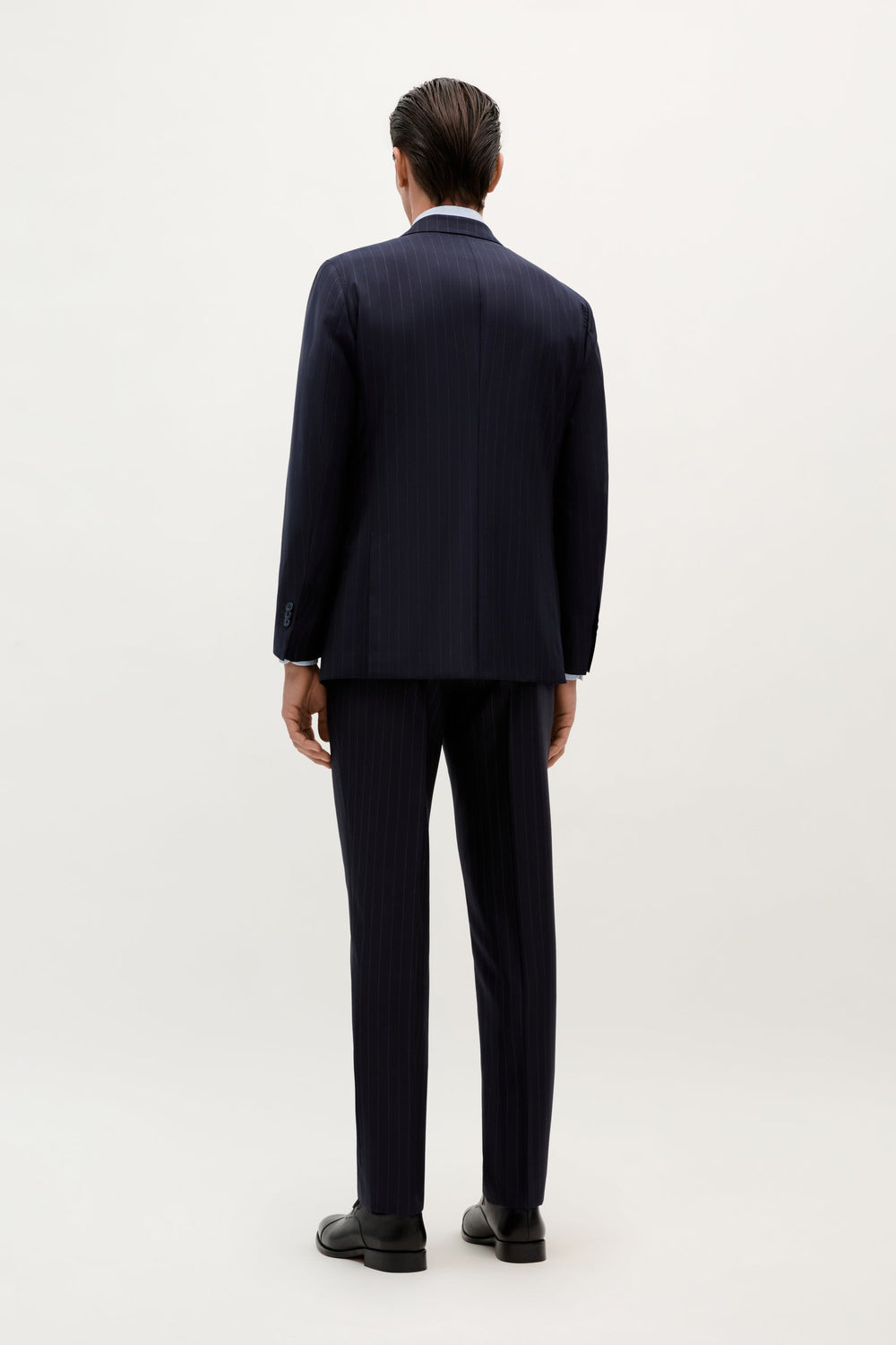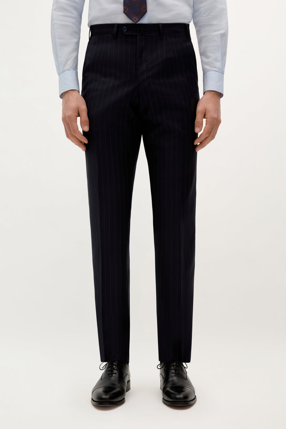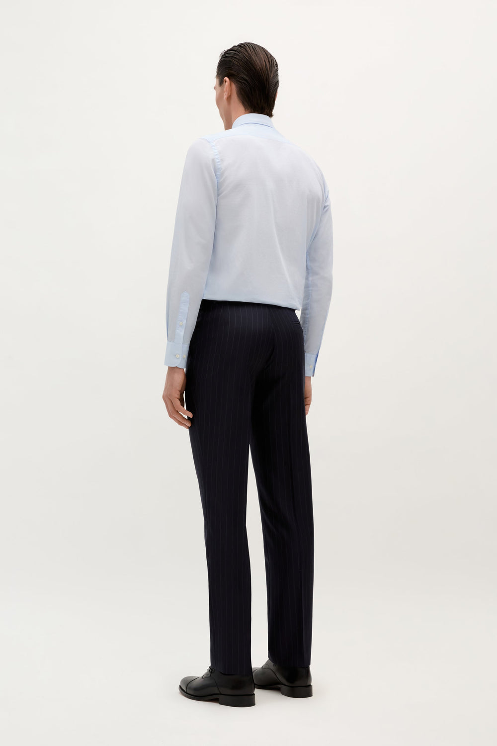 Calças confecionadas em 100% lã italiana. Fecho de zip oculto por placket, colchete e tira abotoada. Dois bolsos laterais. Bolsos com casa de botão na parte traseira. Fabricado em Portugal.