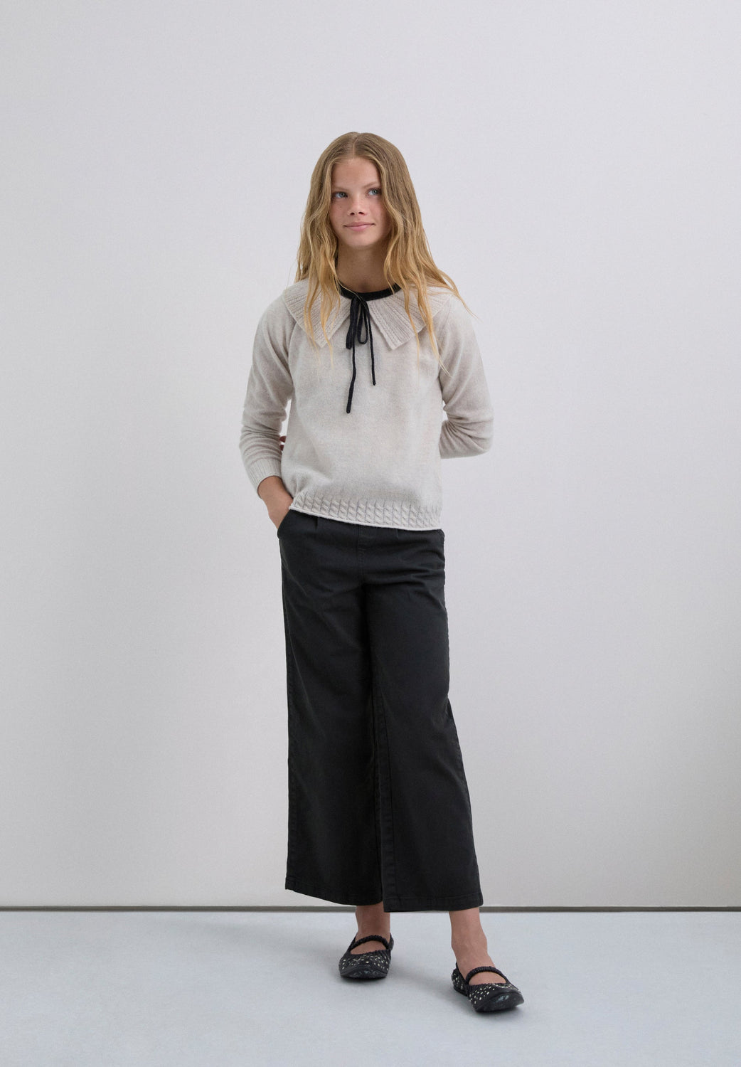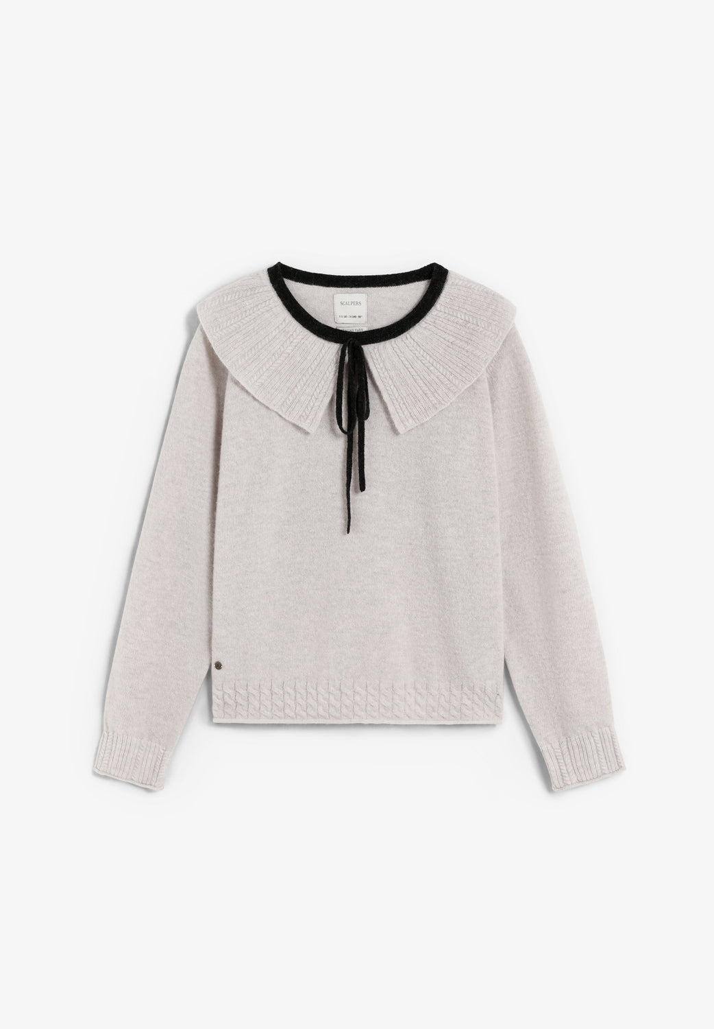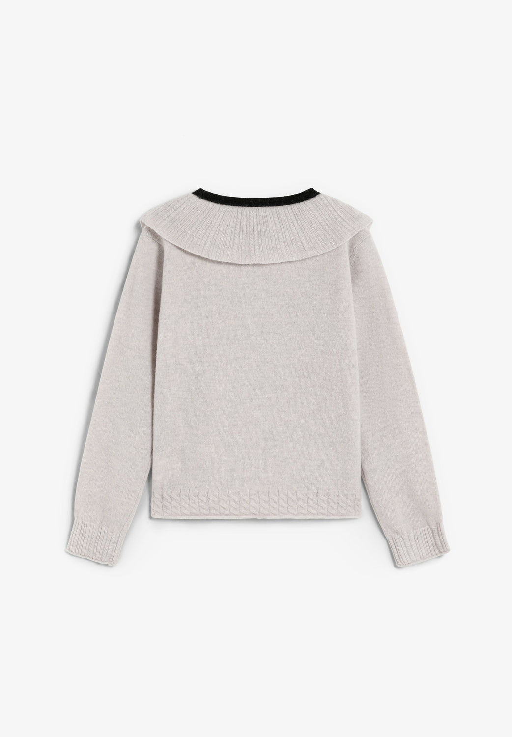 Camisola de malha confecionada em mistura de lã. Corte regular fit. Decote bebé com gola em contraste. Manga comprida e cintura terminada em nervuras.