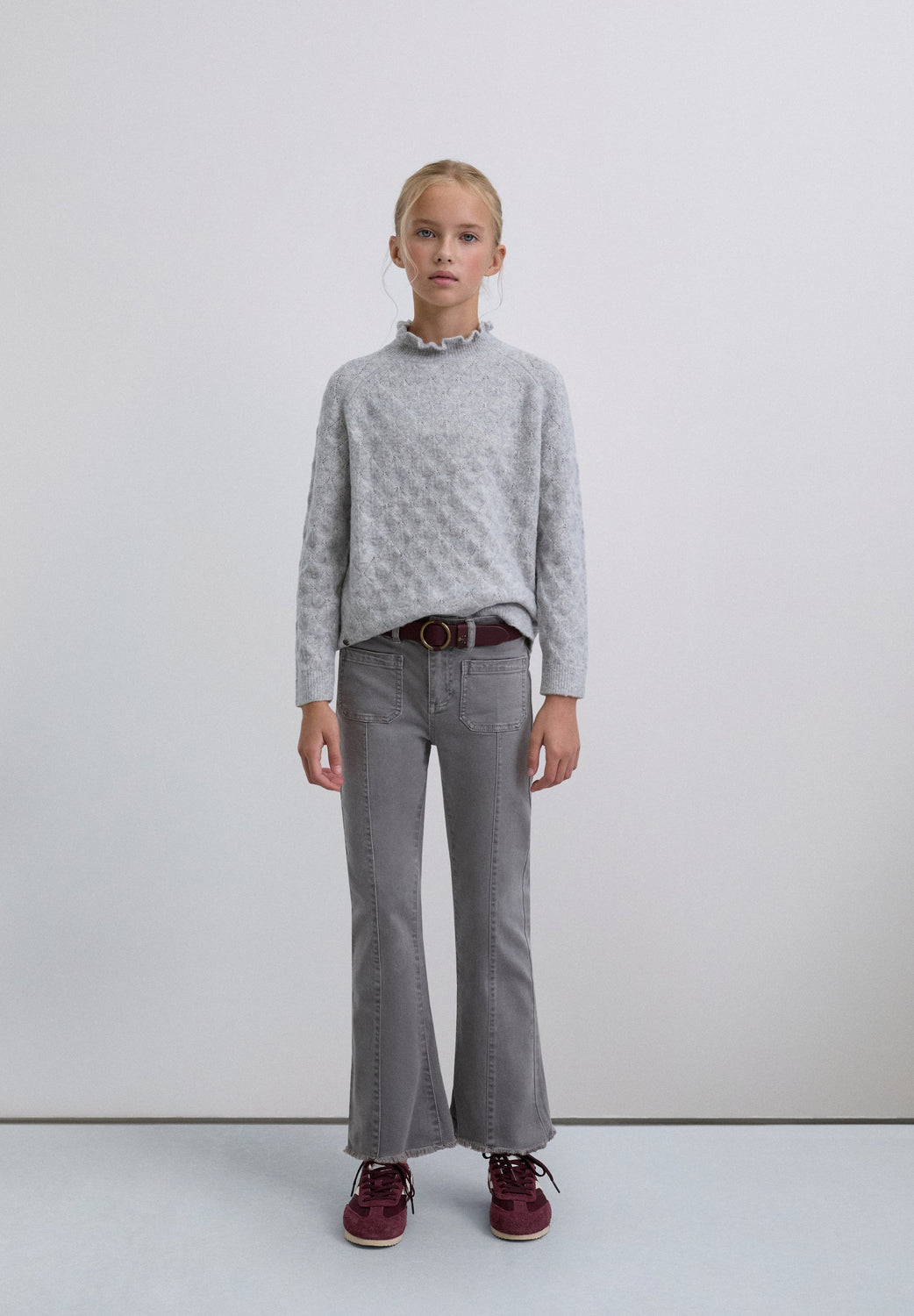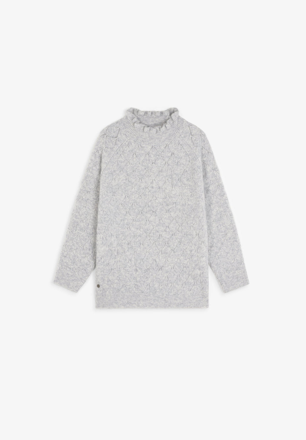 Sweater de malha confecionada em mistura de lã merino. Gola alta com folhos. Manga comprida com acabamentos canelados. Motivo perfurado textura diamante.