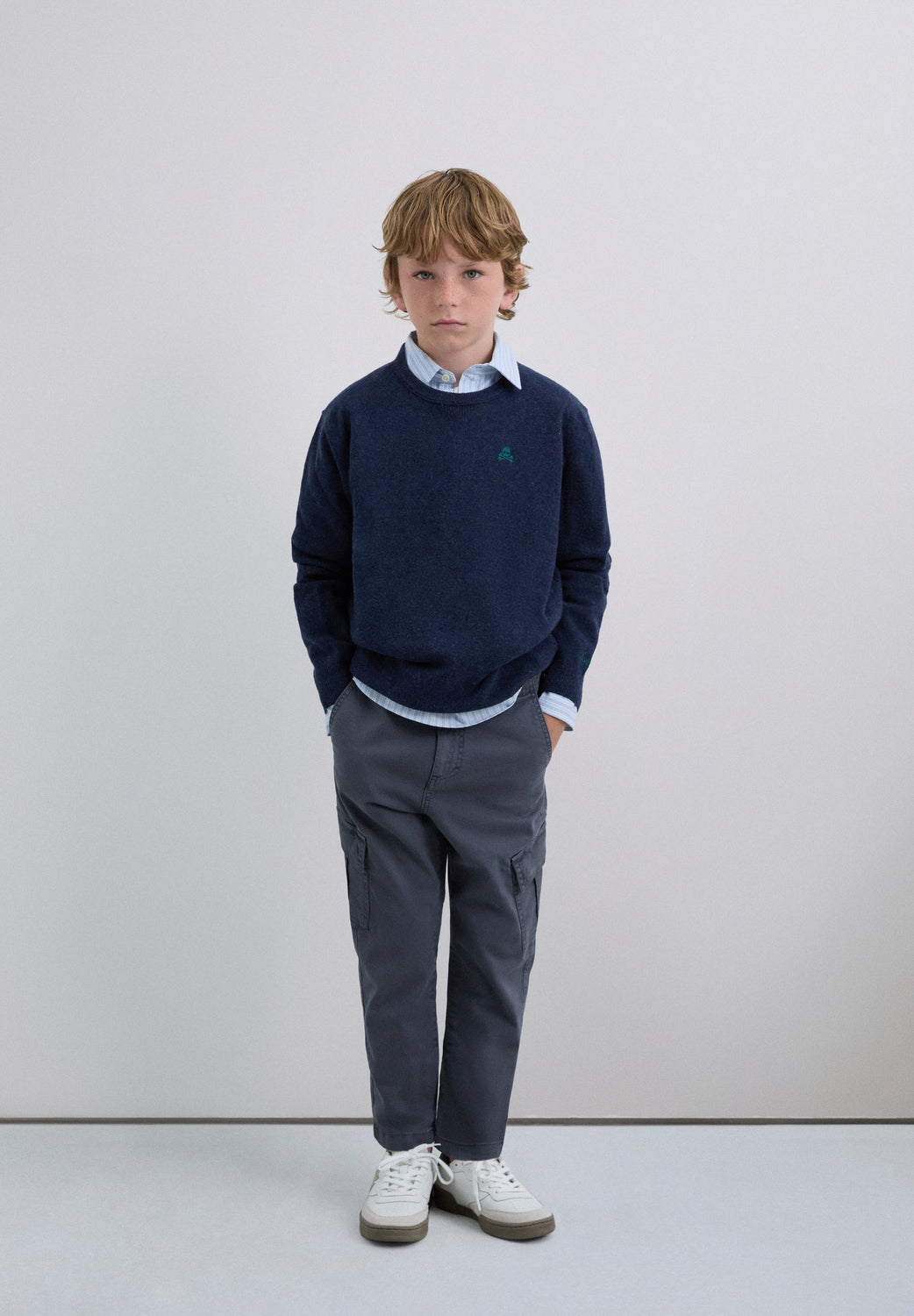 Sweater confecionada em mistura de lã e poliamida. Corte regular fit. Decote redondo. Manga comprida. Pormenor de skull bordada em contraste. Acabamentos em nervuras. Pormenor de skull nas cotoveleiras em contraste.