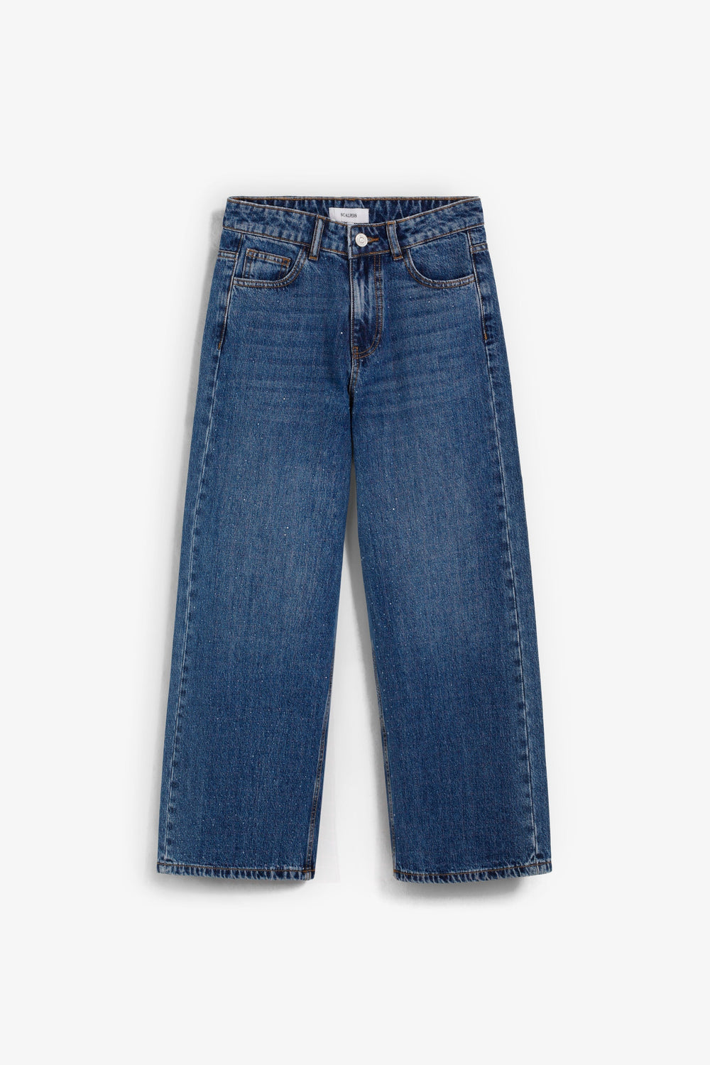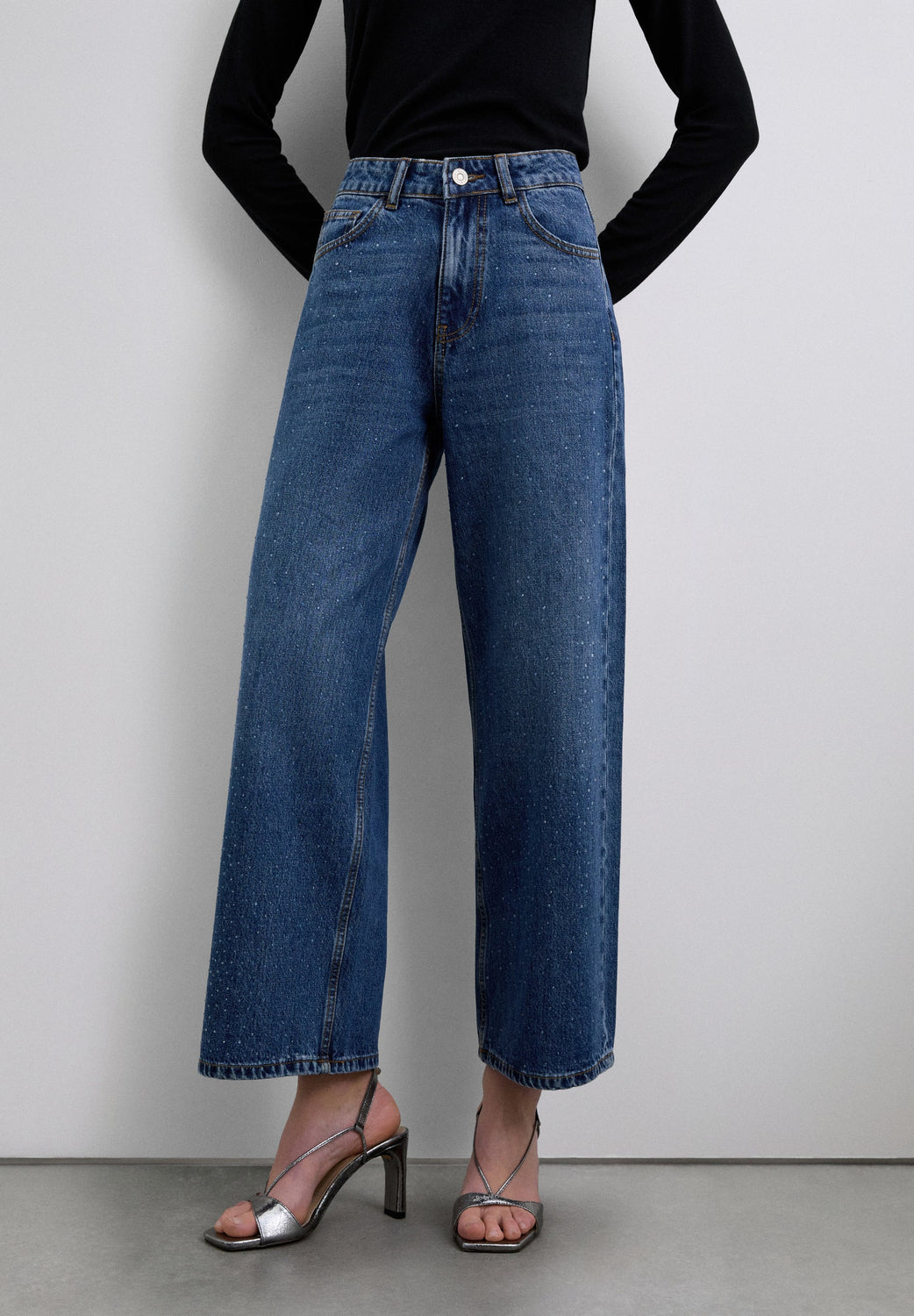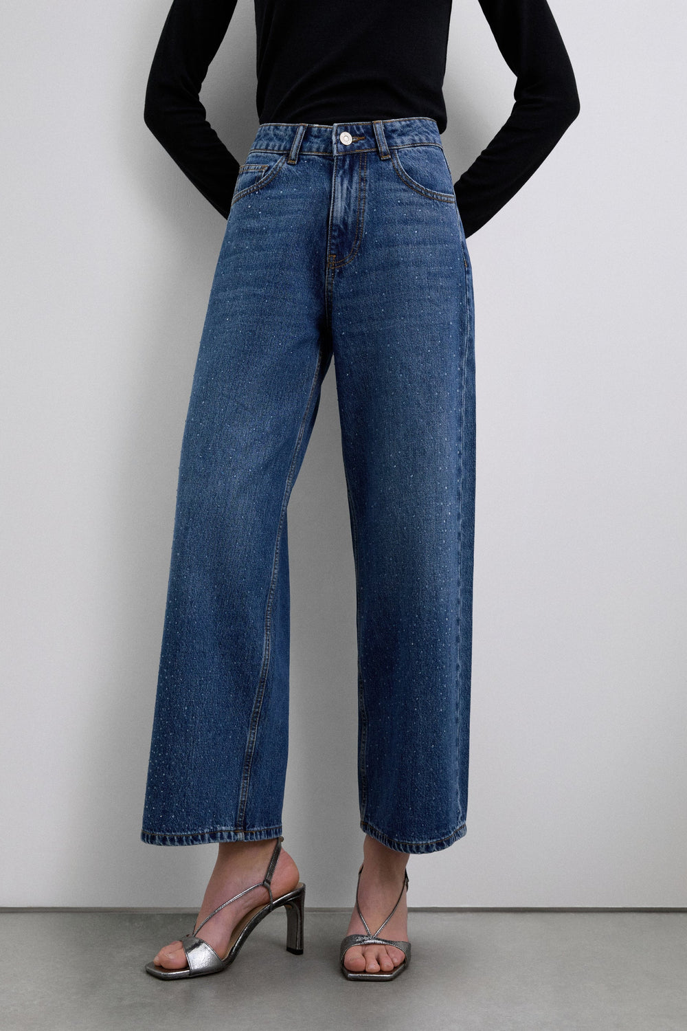 Calças denim confecionadas em 100% algodão, de corte regular fitr, com pormenor de tachas à frente, fecho de correr e botão.