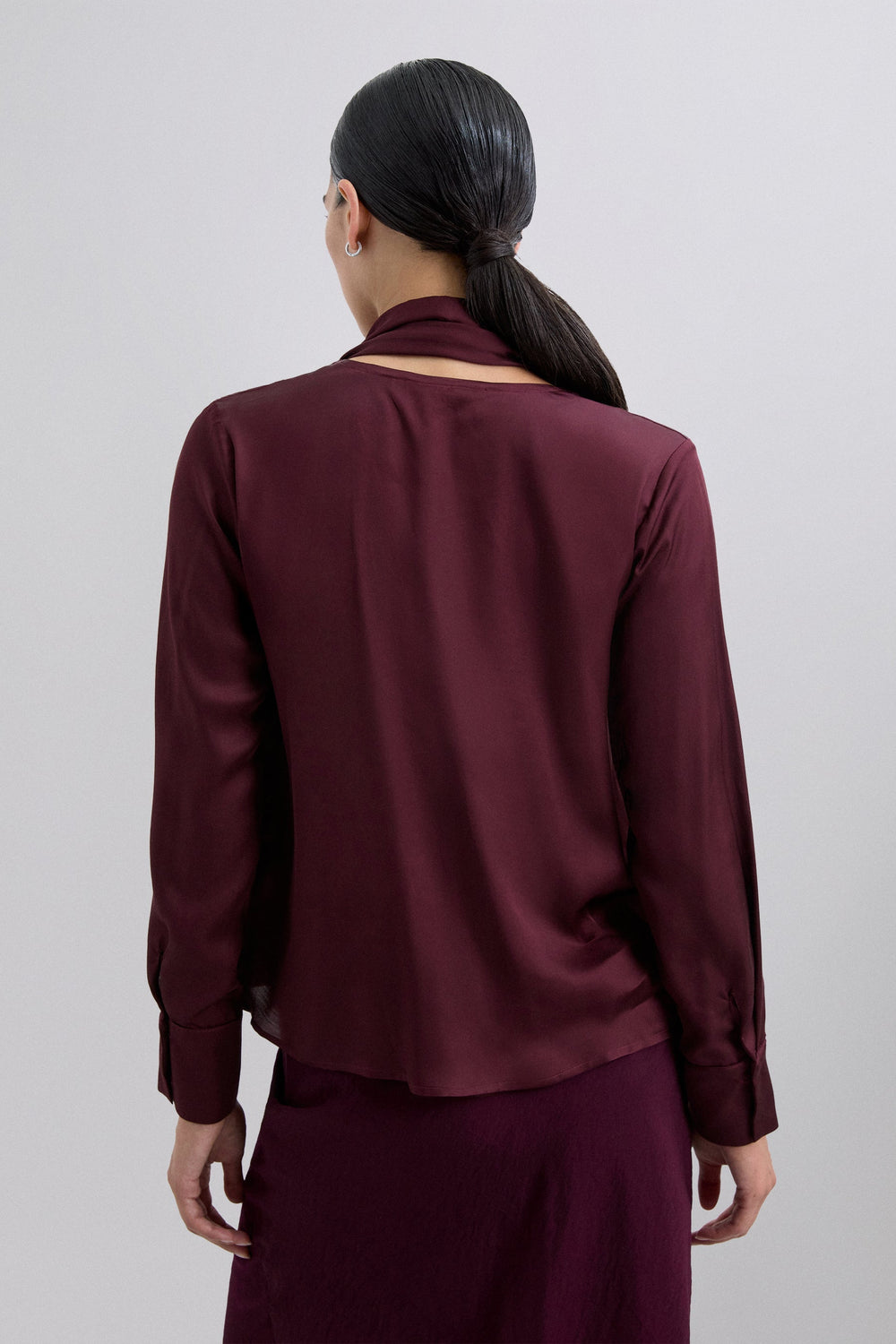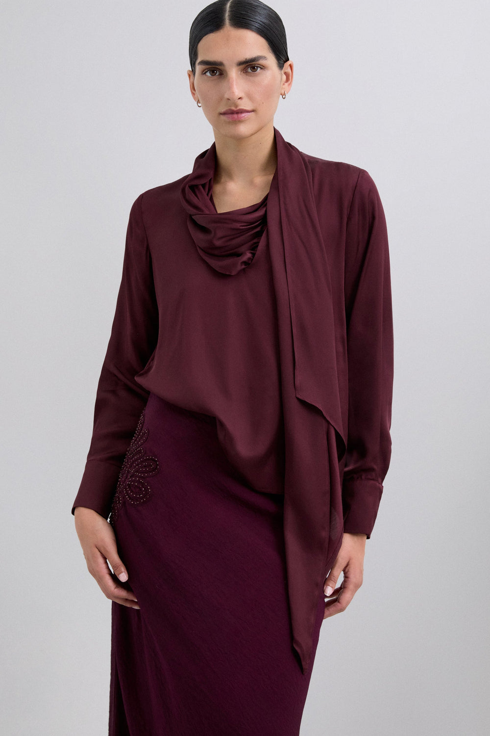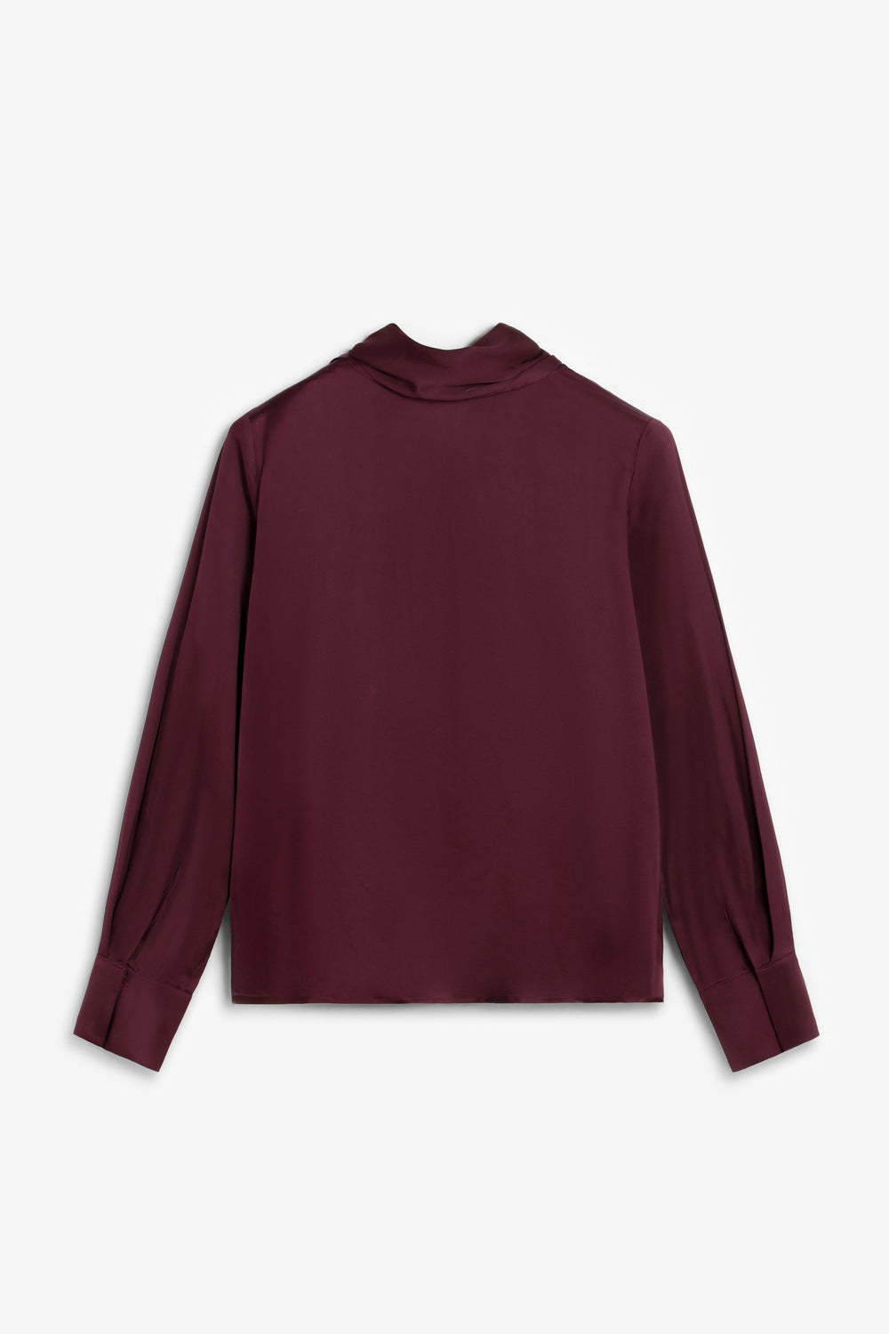Blusa acetinada de manga comprida. Gola drapeada e laço ajustável.