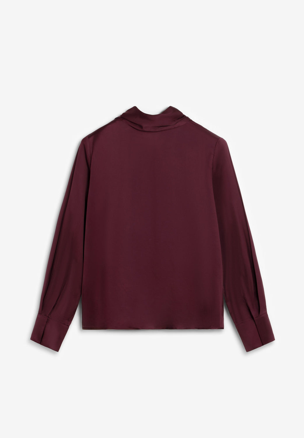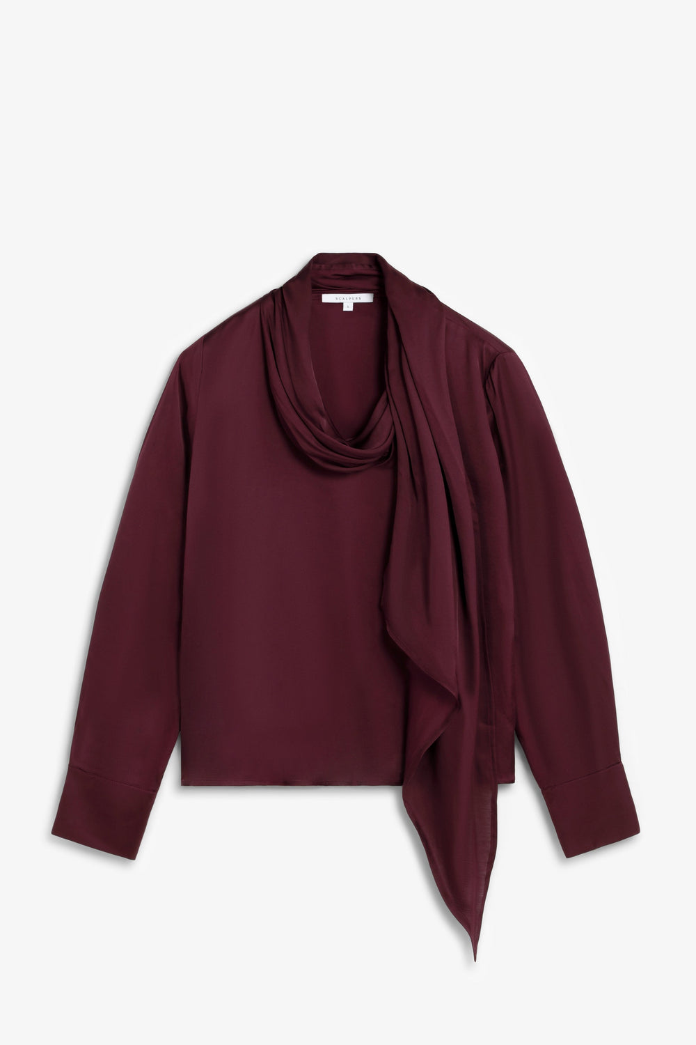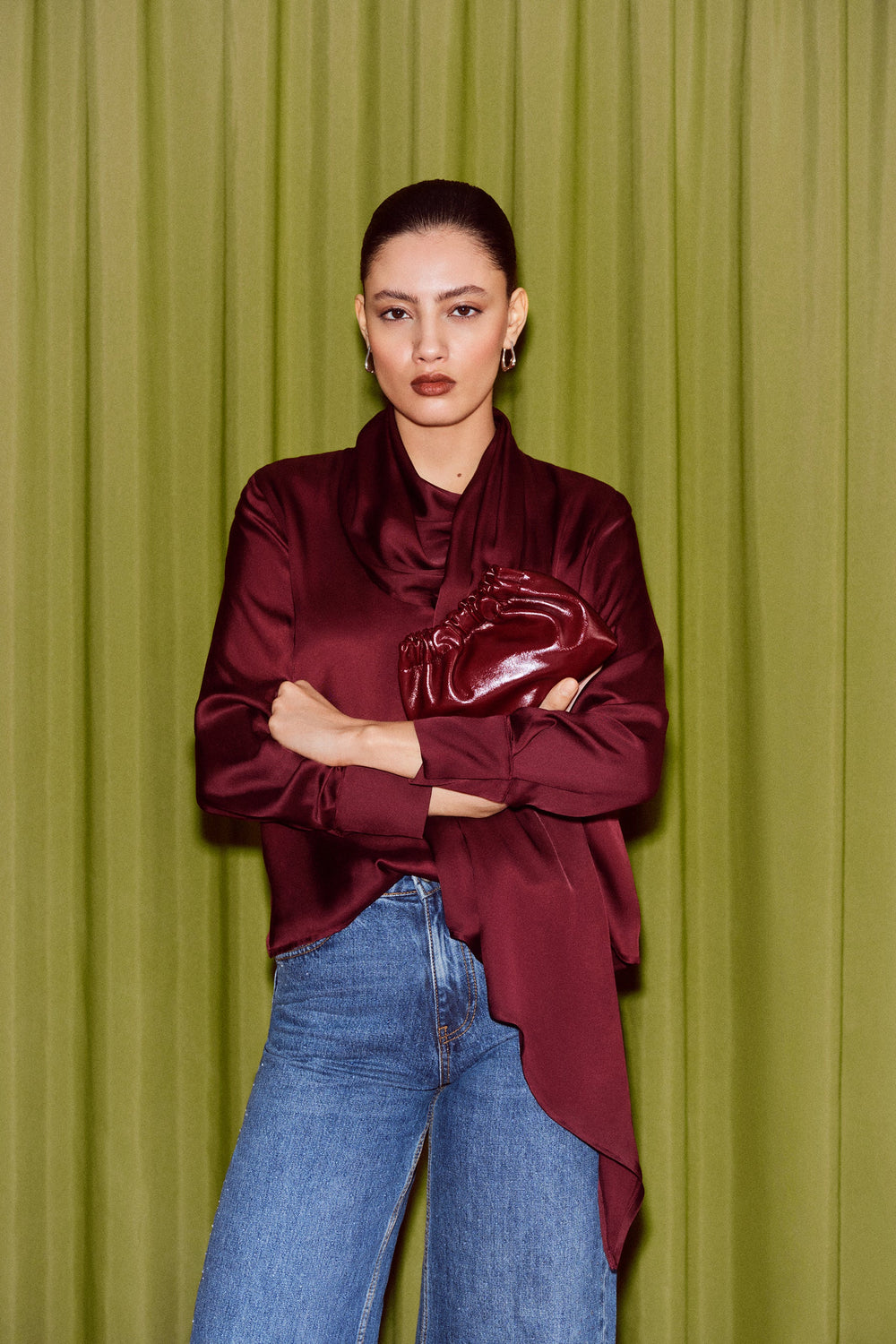 Blusa acetinada de manga comprida. Gola drapeada e laço ajustável.