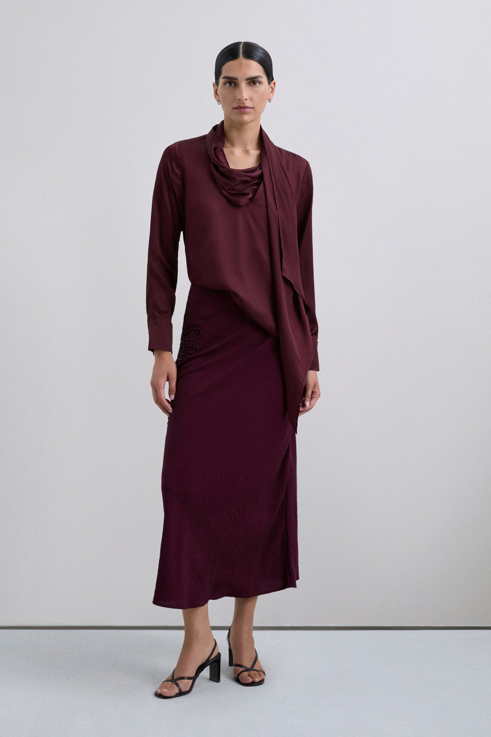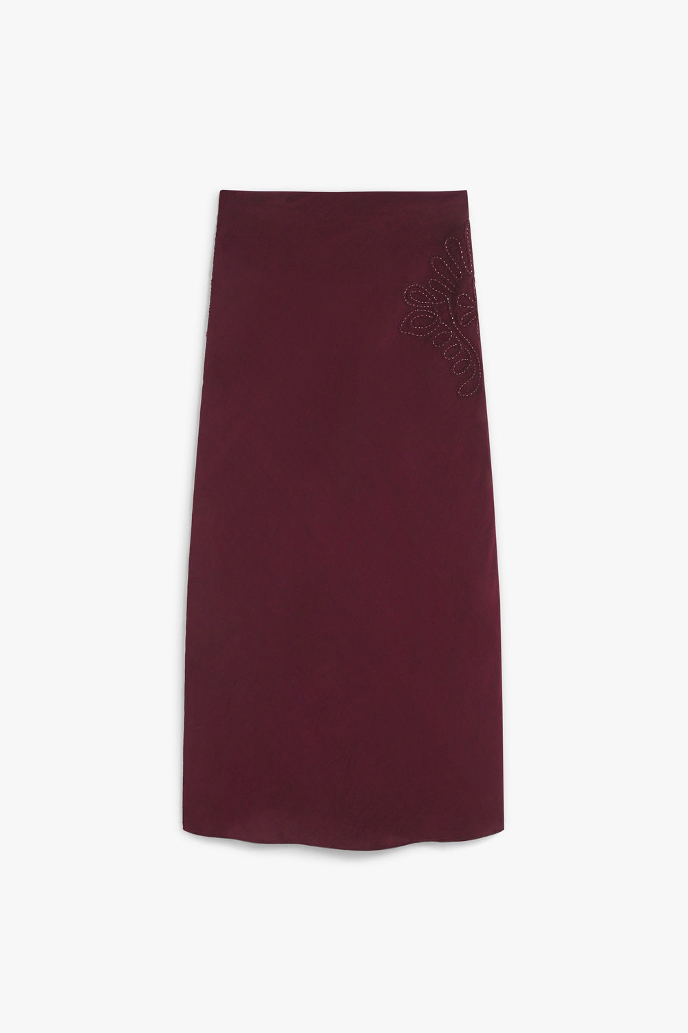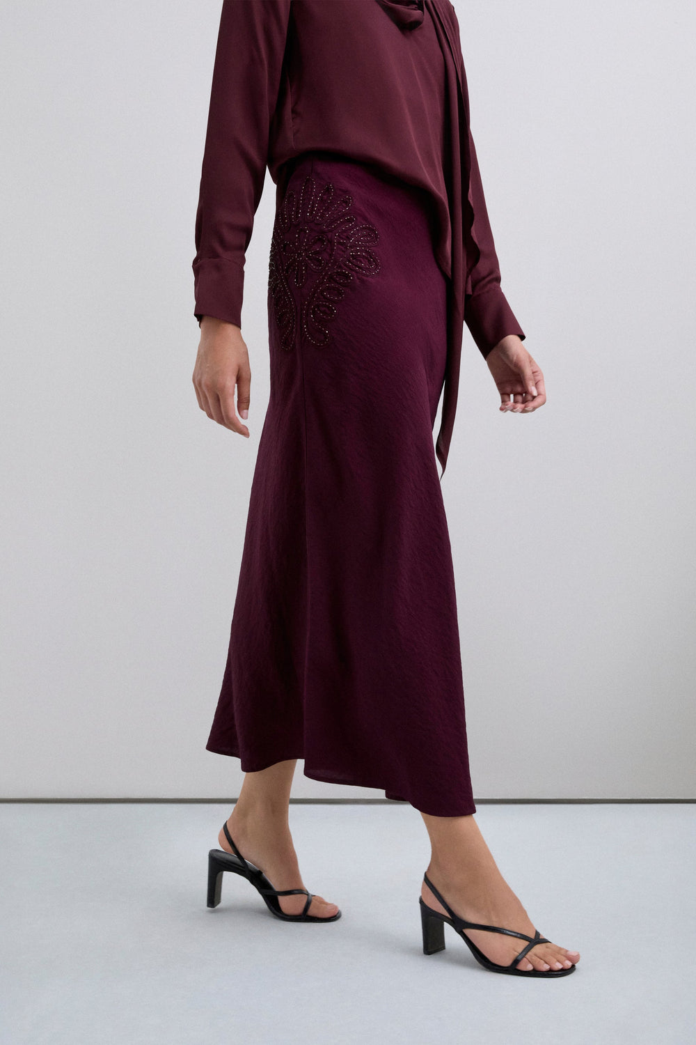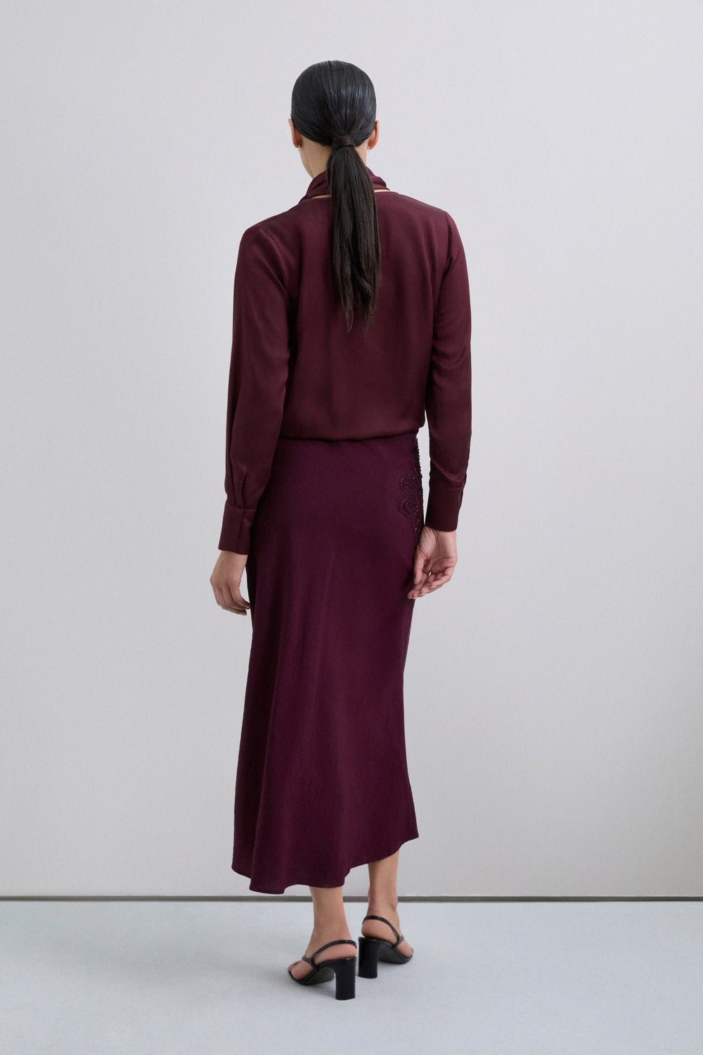 Saia em viés. Mid waist. Tecido fluido. O fecho é um fecho de correr invisível.