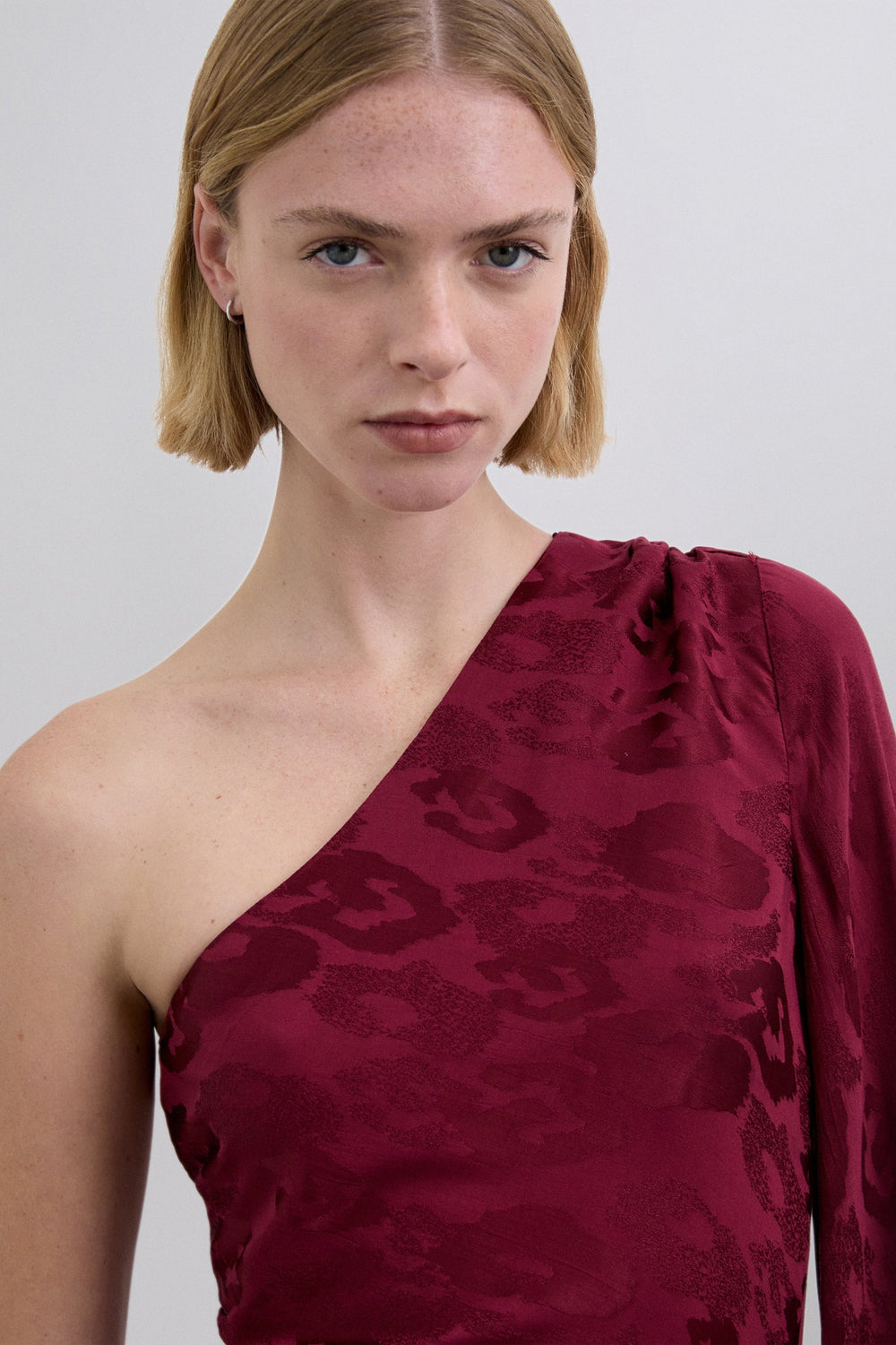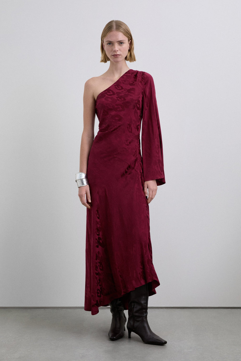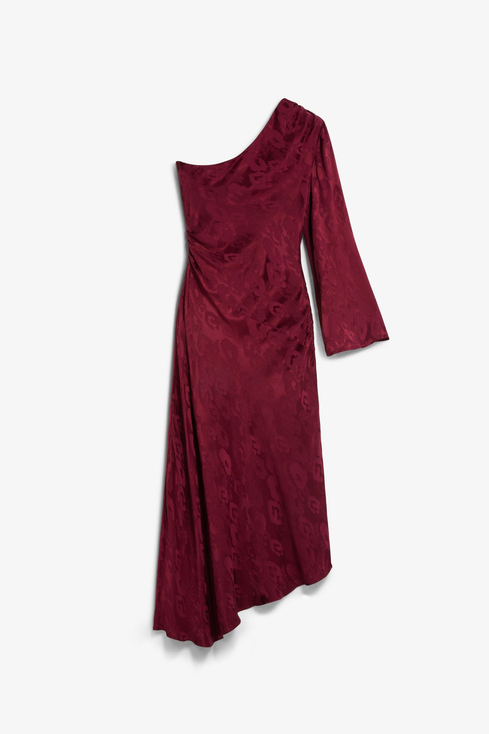 Vestido assimétrico acetinado. Estampado Jacquard. Manga comprida assimétrica. Bainha fluida assimétrica.