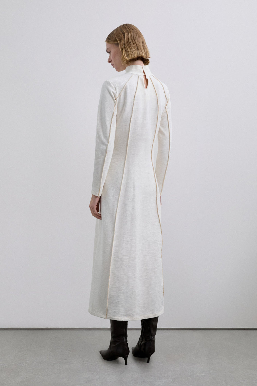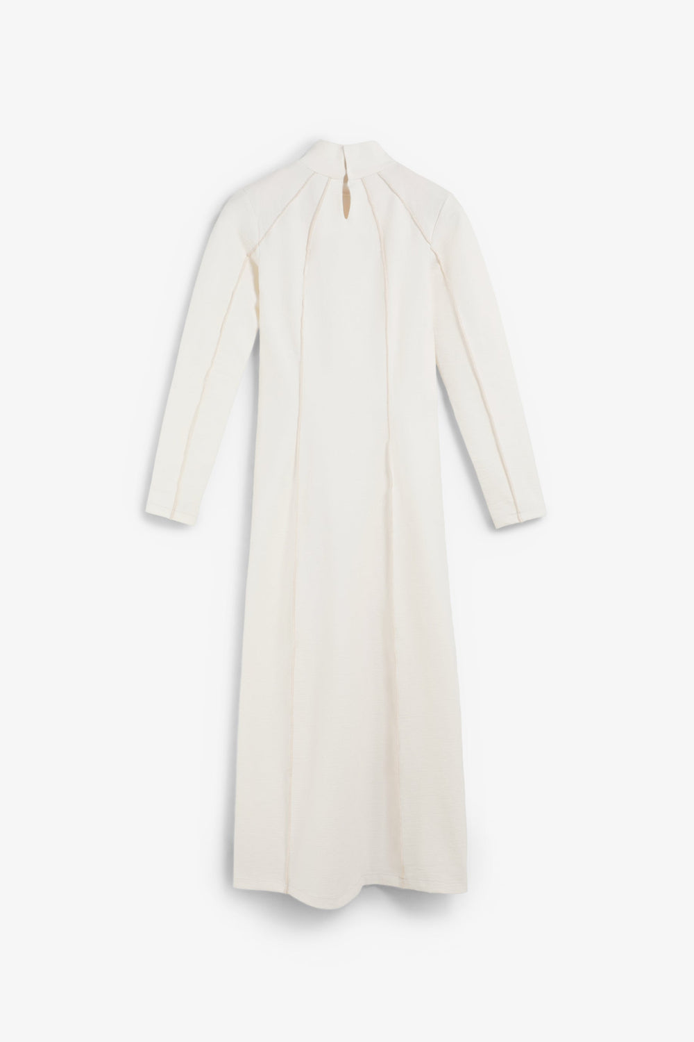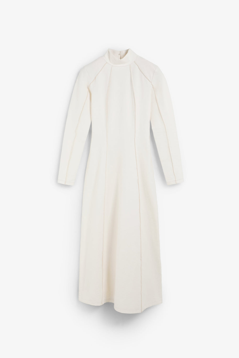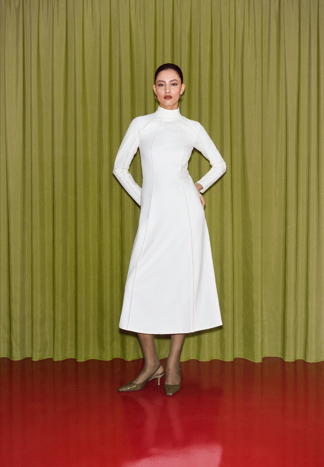 Vestido midi de malha confecionado em algodão BCI. Mangas compridas. Gola alta. Ponto overlock.