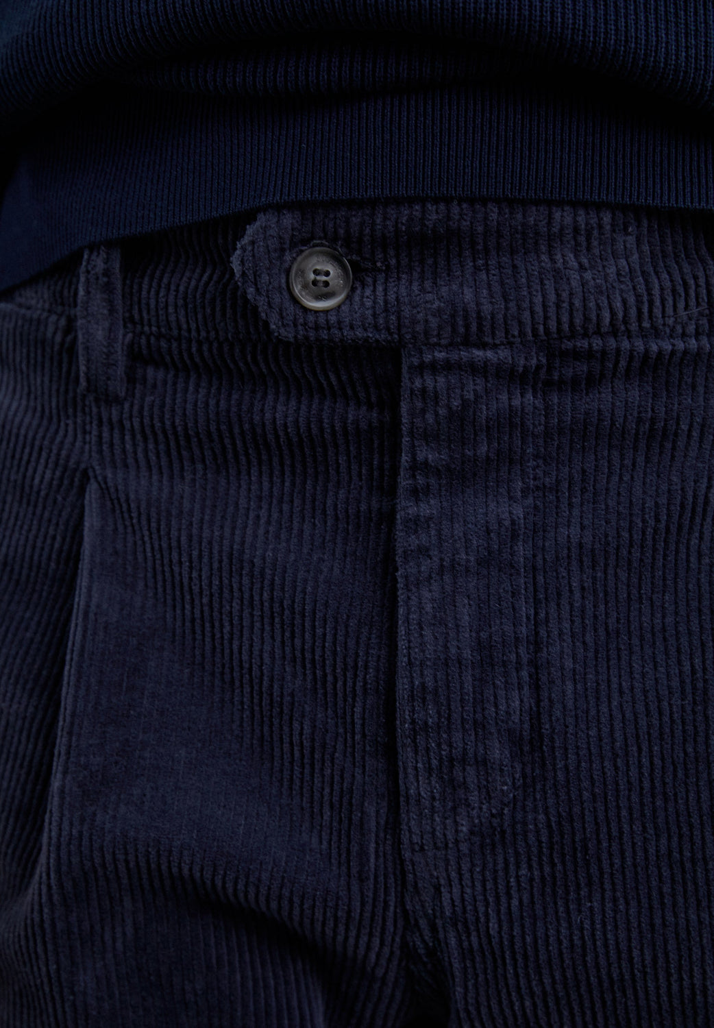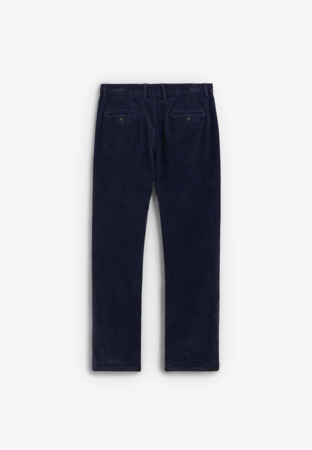 Calças firenze de bombazina. Corte regular. Silhueta a direito. Fecho à frente de botão e fecho de correr. Presilhas para cinto. Bolsos laterais.