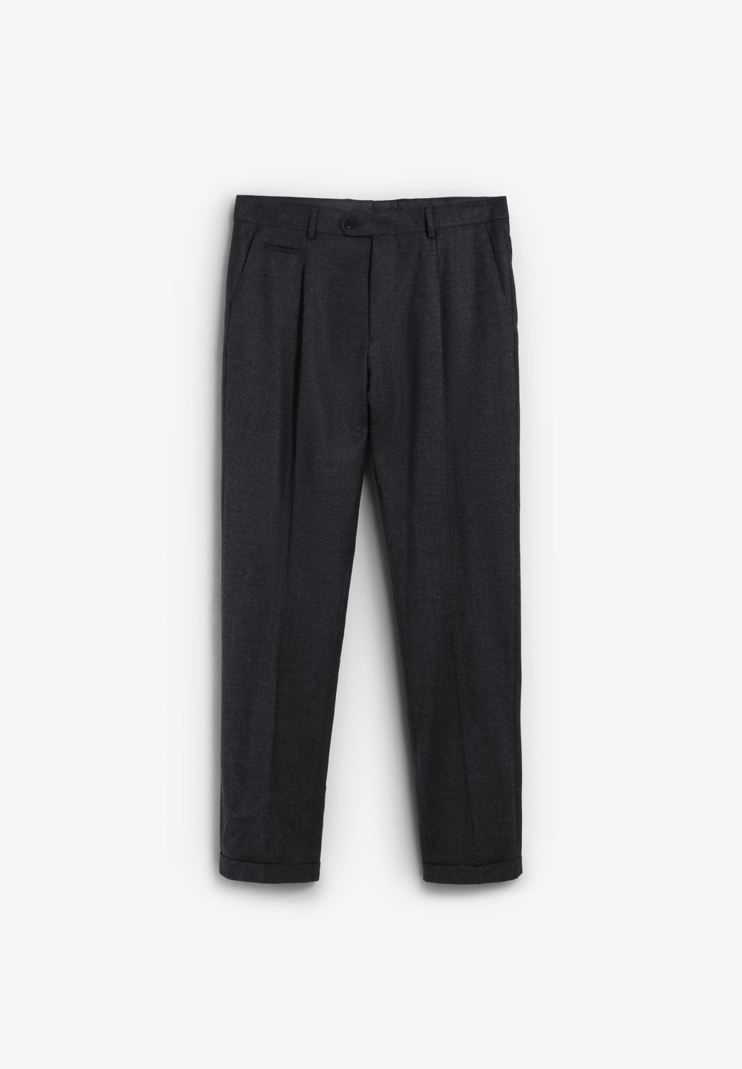 Calças confecionadas em mistura de lã e algodão. Pinças à frente. Bainha com dobra. Fecho com botão e zip à frente. Presilhas na cintura.