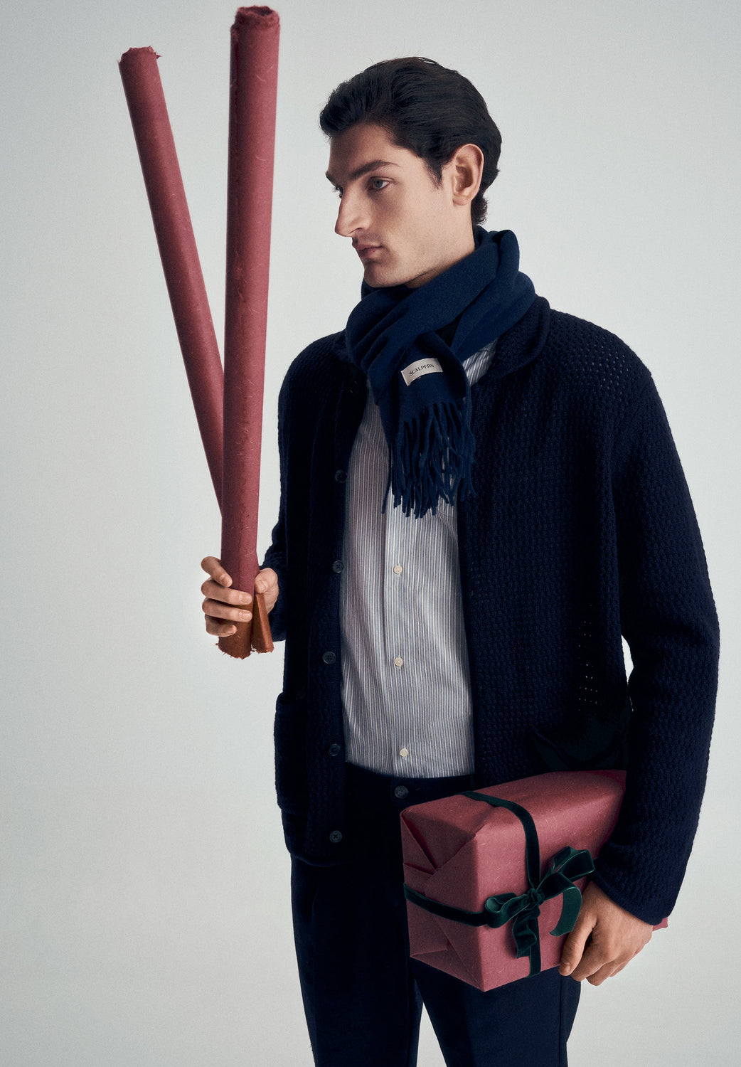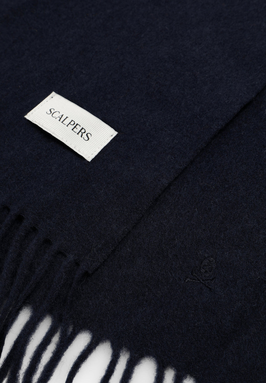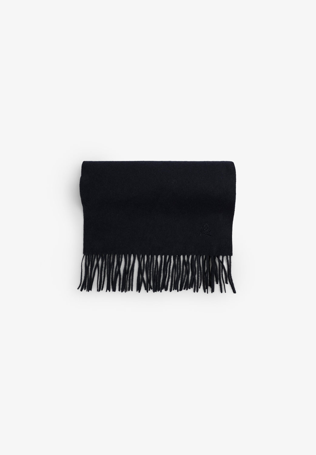 Cachecol confecionado em 100% lã. Pormenor de etiqueta costurada.