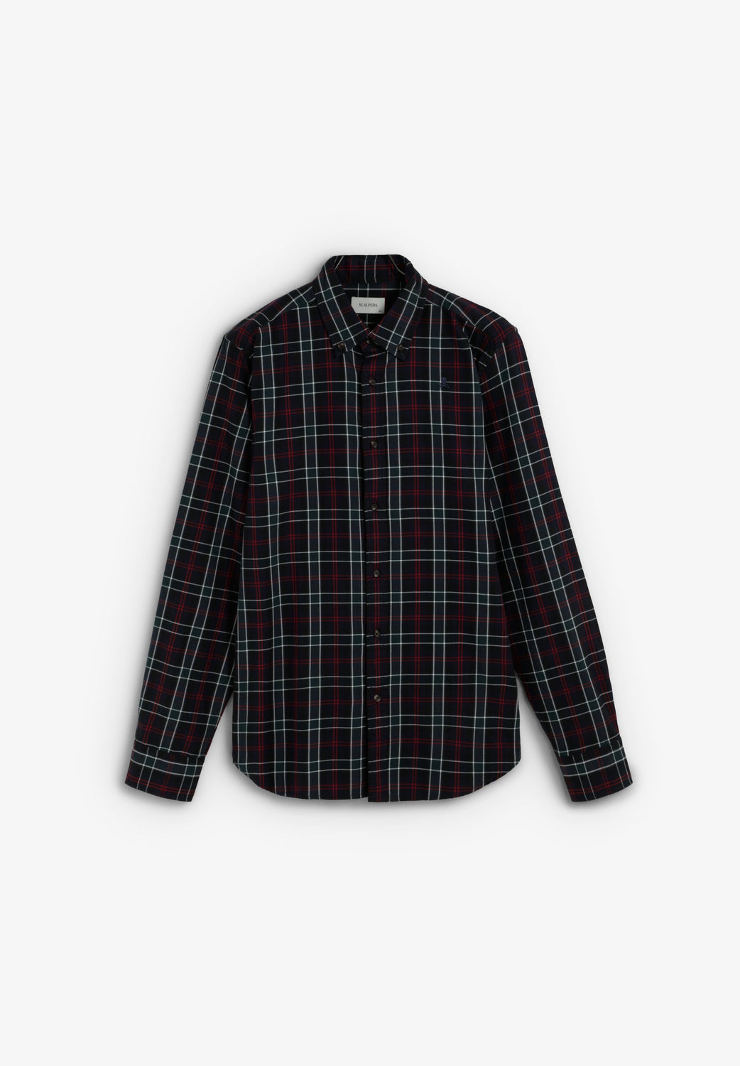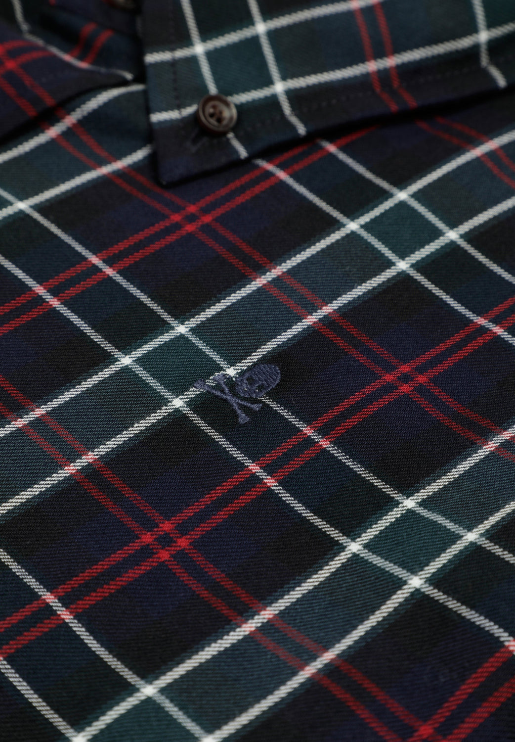 Camisa confecionada em algodão BCI xadrez tartan. Corte regular, gola com botões e fecho de botões. Manga comprida com punhos abotoados e skull bordada em contraste no peito.