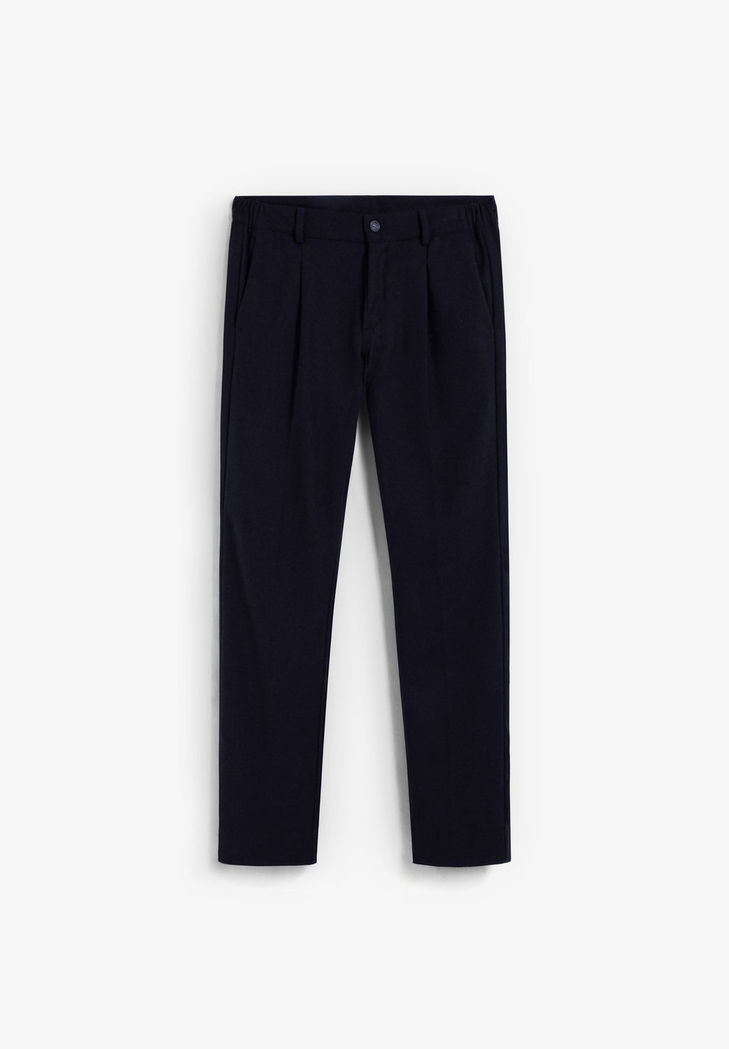 Calças de pinça confecionadas em mistura de lã. Corte regular. Fecho com botão frontal e fecho de correr. Presilhas para cinto. Bolsos laterais e traseiros.