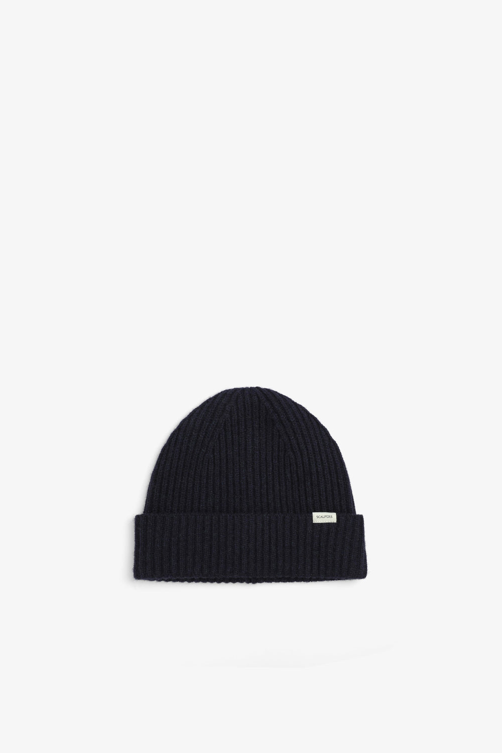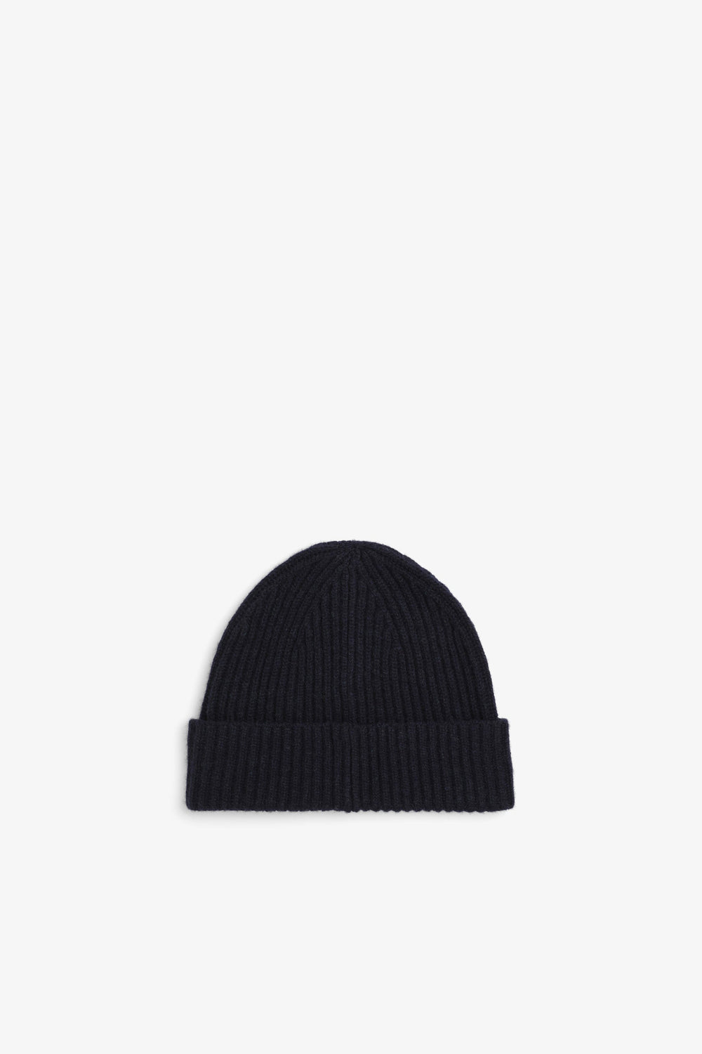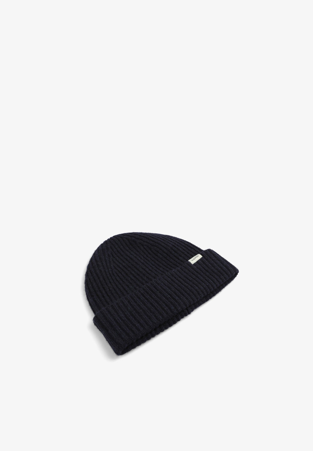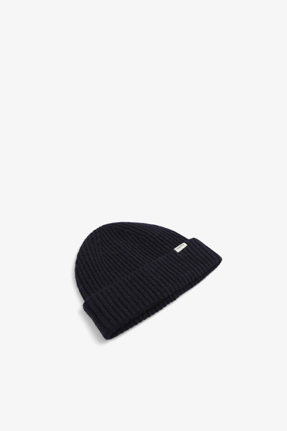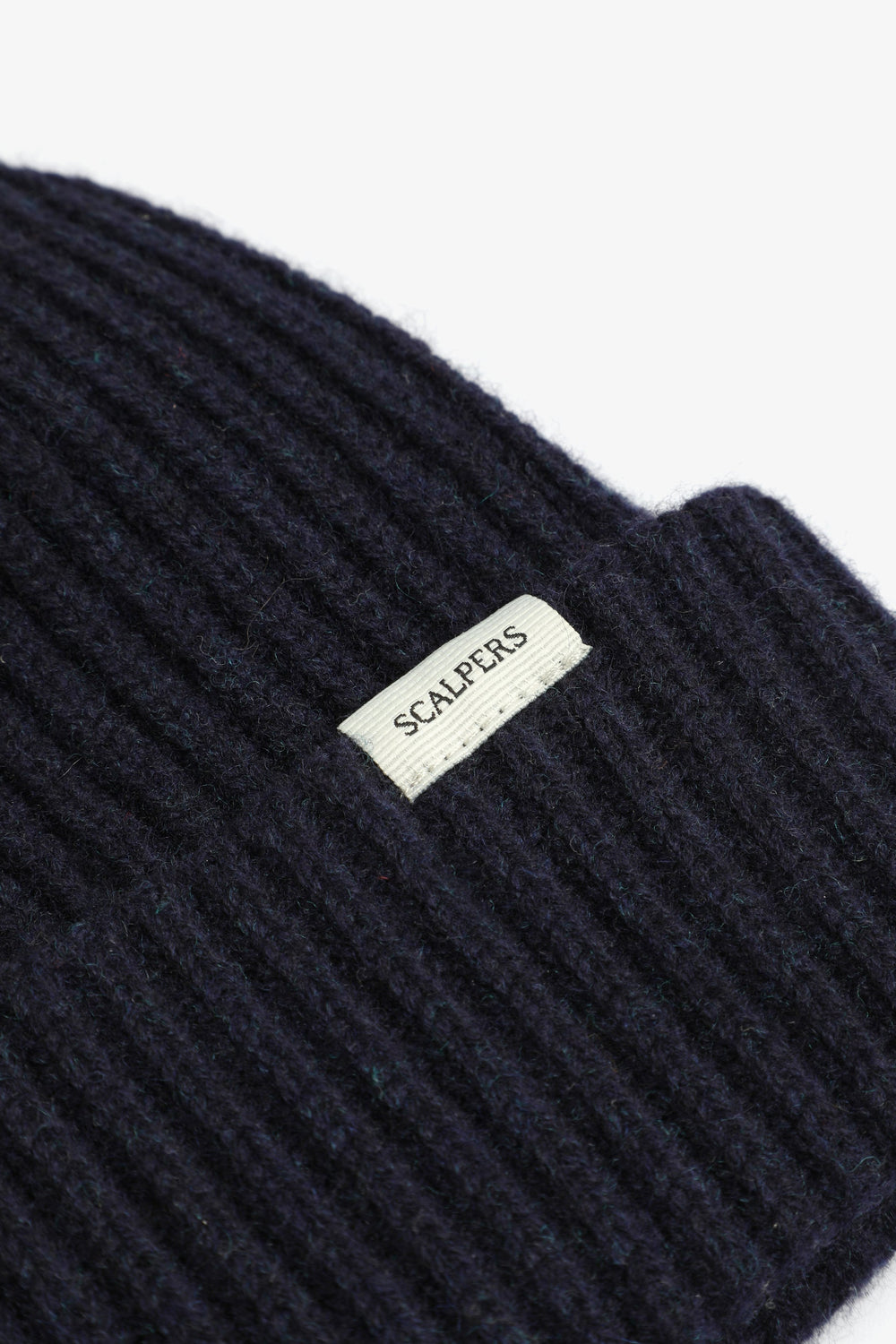 Gorro de malha confecionado em lã e caxemira. Pormenor de enrolado e etiqueta.