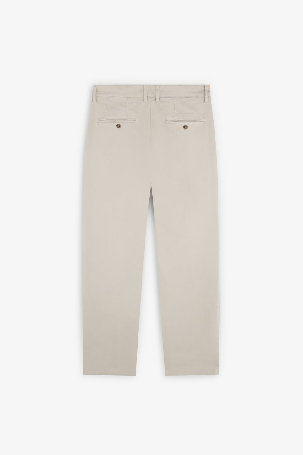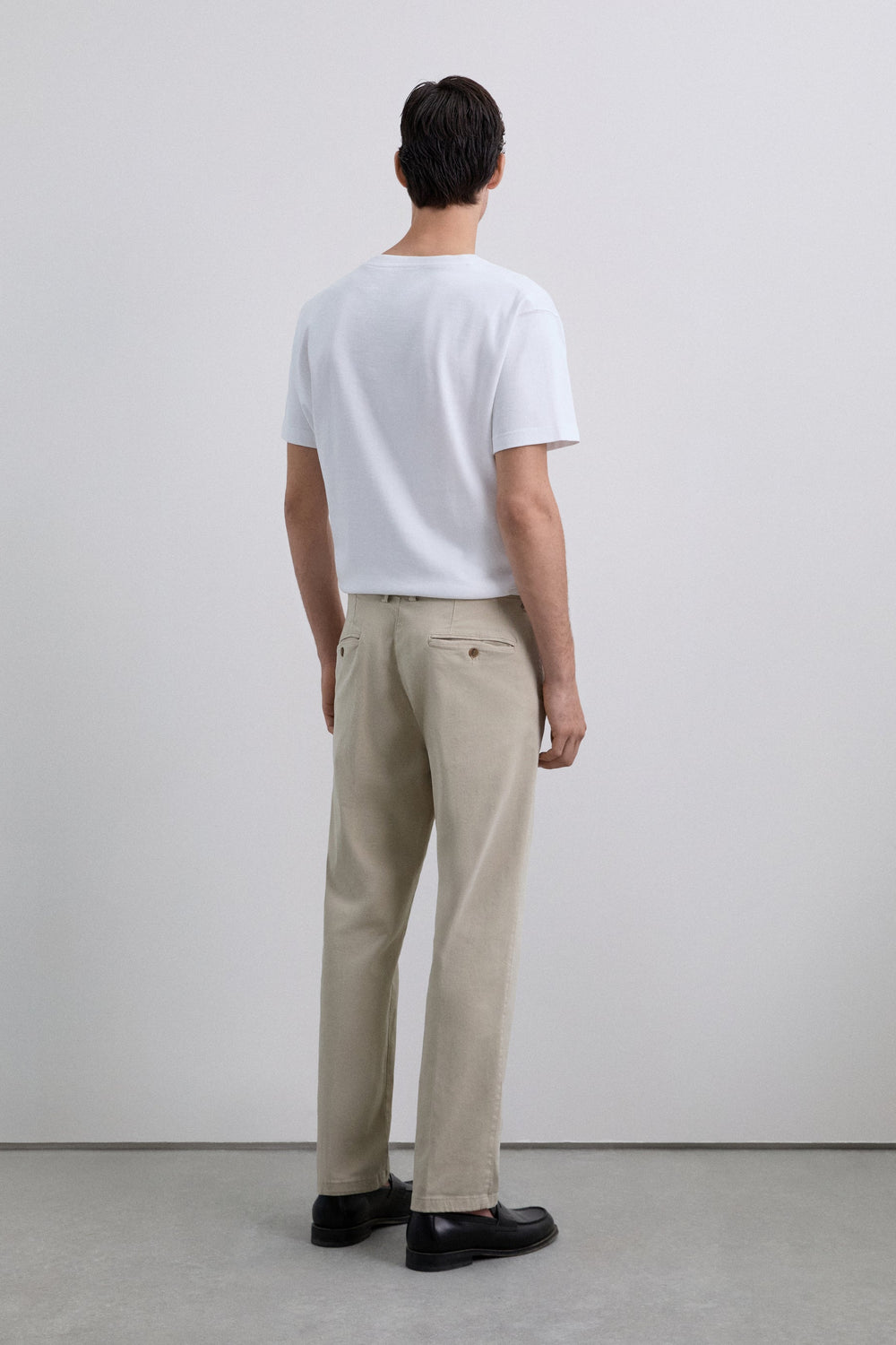 Calças chinos confecionadas em algodão ligeiramente elástico. Corte largo com darts. Fecho com zip oculto com placket e botão na cintura. Bolsos laterais e atrás. Presilhas na cintura.