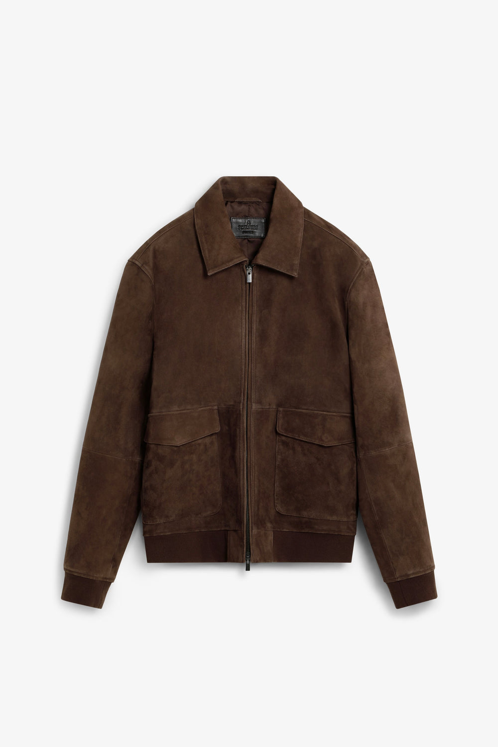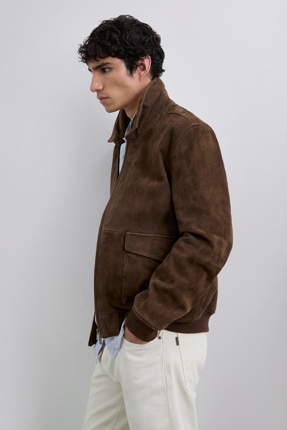 Blusão de camurça com gola camiseiro. Fecho à frente com duplo fecho de correr. Bainha e punhos canelados. Dois bolsos à frente com fecho por aba.